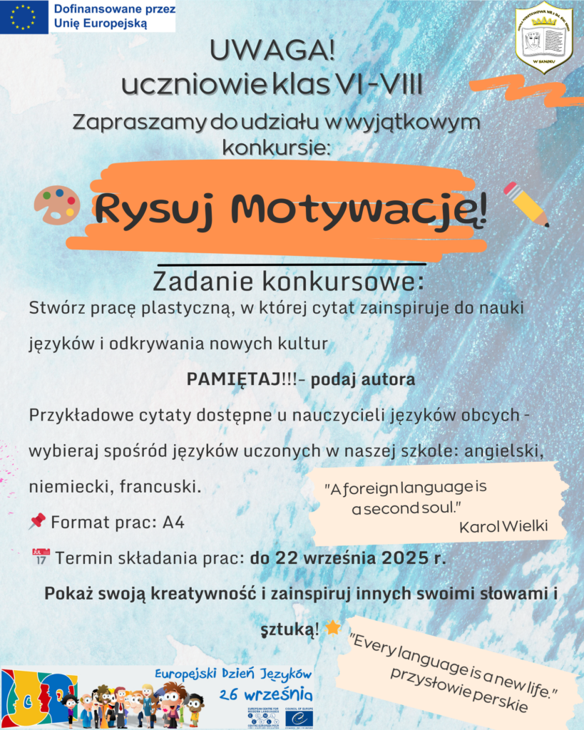 Stwórzcie pracę plastyczną z cytatem, który Was motywuje – możecie go przedstawić kaligraficznie na tle własnej ilustracji. Pokażcie, jak słowa mogą inspirować do nauki języków i odkrywania nowych kultur!